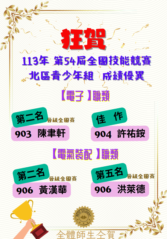 !賀!903陳聿軒同學、904許祐銨同學、906黃漢華同學、906洪萊德同學 參加第54屆全國技藝競賽 北區分區青少年組電子職類及電氣裝配職類 榮獲佳績!